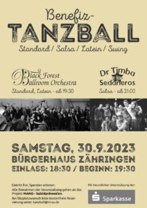 am kommenden Samstag, 30.9.23 gibt es ein Event der besonderen Art: Den Benefiz-Tanzball mit gleich zwei Live-Tanzbands. Um 19:30 ist das Black Forest Ballroom Orchestra mit Standard & Latein zu hören und um 21:00 folgt Dr Timba y los Sedaneros mit Salsa. Der Eintritt ist frei – Spenden sehr erwünscht. Alle Einnahmen gehen an das Freiburger Beratungsprojekt für suizidgefährdete Erwachsene „MANO“. Wir freuen uns auf zahlreiche Tanzfreudige!