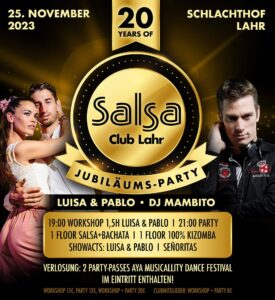 Der Salsa Club Lahr feiert sein 20-jähriges Bestehen und ihr seid alle herzlich eingeladen. Mit dem Schlachthof Lahr haben viele von uns schöne Erinnerungen – gerade auch mit den Salsa-Meisterschaften, die der Club dort erfolgreich ausgetragen hatte.