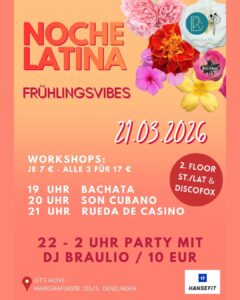Am 21.03. laden wir euch herzlich zu unserer nächsten Noche Latina ein – voller Rhythmus, Lebensfreude und frischer Frühlingsenergie! Lasst uns gemeinsam den Frühling begrüßen – mit heißen Latin-Beats, guter Laune und ganz viel Tanz!